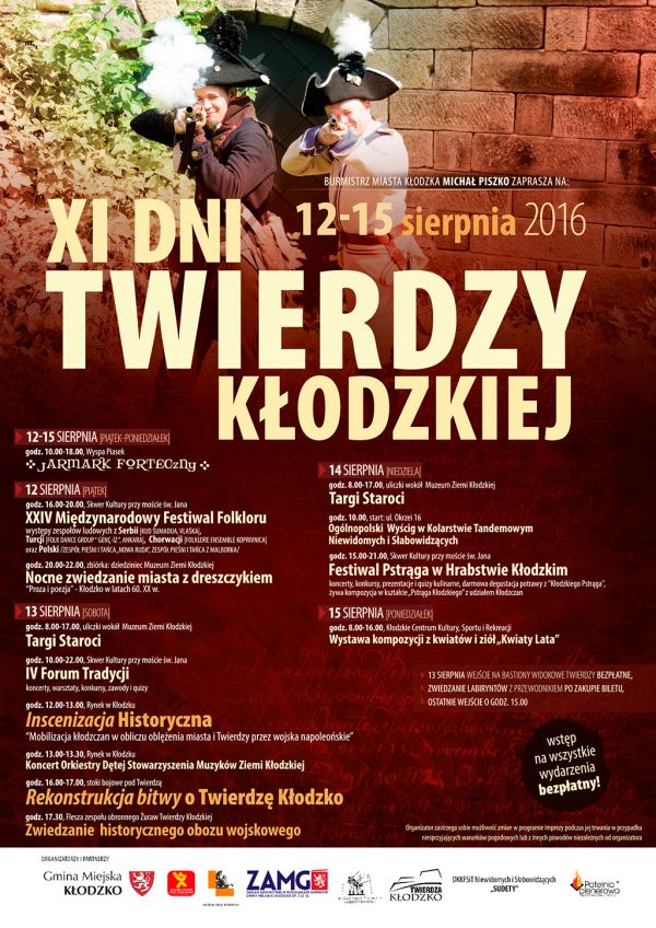 W dniach 12-15 sierpnia już po raz jedenasty swoje wielkie święto obchodzić będzie Twierdza Kłodzka! W ramach tych kilku świątecznych dni dla wszystkich odwiedzających miasto nad Nysą Kłodzką gospodarze przygotowali wiele atrakcji m.in.: jarmark forteczny, XXIV Międzynarodowy Festiwal Folkloru (występy zespołów z Serbii, Chorwacji i Polski), nocne zwiedzanie miasta, targi staroci, Festiwal Pstrąga w Hrabstwie Kłodzkim, wystawę kompozycji z kwiatów i ziół, warsztaty, konkursy, zwiedzanie podziemnych labiryntów i bastionów widokowych twierdzy.