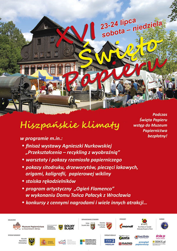 W dniach 23 - 24 lipca zapraszamy do Dusznik-Zdroju, gdzie już po raz szesnasty swoje wielkie święto obchodził będzie PAPIER! Tegoroczna edycja będzie miała charakter polsko-hiszpański w ramach obchodów ESK Wrocław - San Sebastian 2016. Patronat honorowy nad wydarzeniem objęli: Marszałek Województwa Dolnośląskiego, Ambasada Hiszpanii w Polsce, Polska Organizacja Turystyczna oraz Dolnośląska Organizacja Turystyczna.