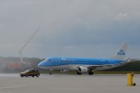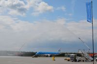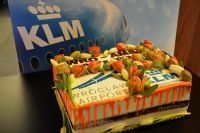 Pierwszy samolot linii KLM wylądował dzisiaj na wrocławskim lotnisku witany przez gospodarzy lotniska i zaproszonych gości. Nie obyło się od uroczystego salutu wodnego, ryku syren, a także okolicznościowego tortu ozdobionego, a jakże, holenderskimi tulipanami.