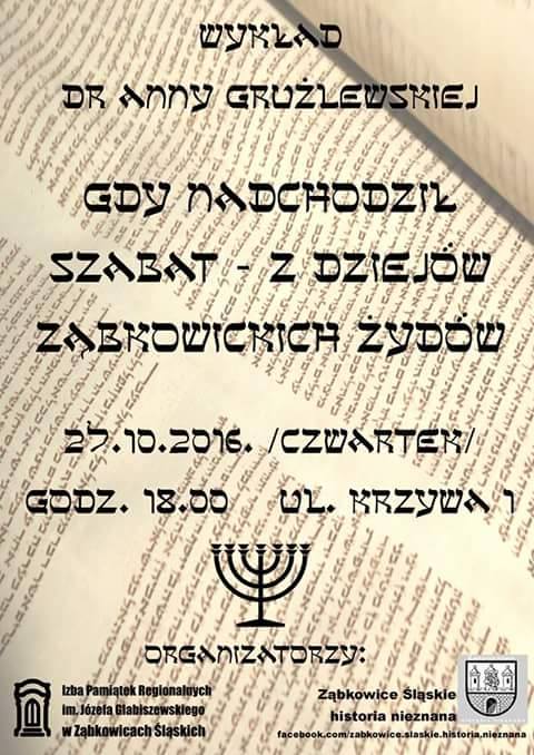 "Ząbkowice Śląskie" – miasto wiele wyznań – pod takim hasłem odbywać się będa w najbliższych miesiącach wykłady tematyczne w Izbie Pamiątek Regionalnych (ul. Krzywa 1) w Ząbkowicach Śląskich. 28 października o godz. 17:00 zapraszamy na wykład dr Anny Grużlewskiej, poświęcony historii społeczności żydowskiej "Gdy nadchodzi Szabat – z dziejów ząbkowickich żydów". Podczas kolejnych spotkań wygłoszone zostaną wyłady na temat: reformacji, kontrreformacji, gminy ewangelickiej itp.