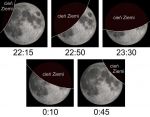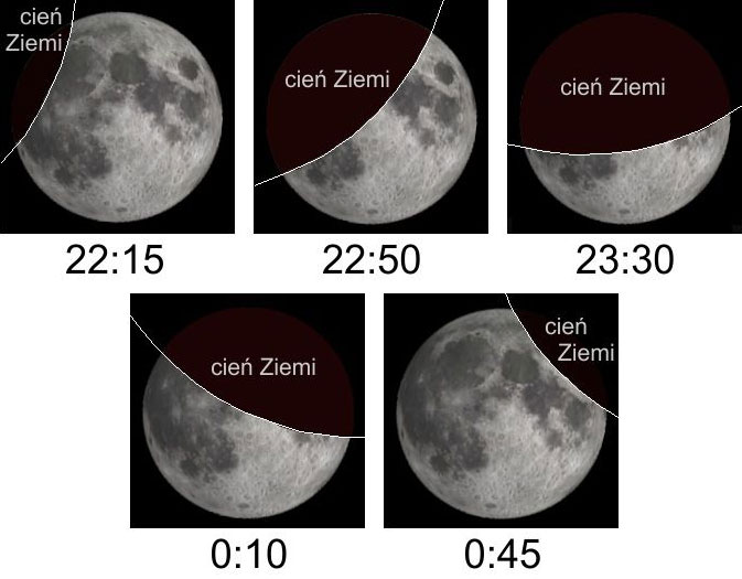 O godzinie 22:01:44 rozpocznie się zaćmienie częściowe Księżyca. Lewa część jego tarczy (widocznej w południowo-wschodniej części nieba) zacznie ciemnieć – wchodzić w cień Ziemi. Maksymalna faza zaćmienia będzie o godz. 23:30:45 – 65% tarczy naszego naturalnego satelity znajdzie się w cieniu Ziemi. Selenonauta widziałby wtedy całkowite zaćmienie Słońca. Można zauważyć, że cień Ziemi padający na Księżyc jest wyraźnie zaokrąglony. Już w starożytności ludzie znali ten fakt – był to wtedy jedyny obserwacyjny dowód, że Ziemia jest kulą. Zaćmienie częściowe zakończy się po północy, o godz. 0:59:41, zaś zaćmienie częściowe półcieniowe o godz. 2:17:37. Zachód Księżyca nastąpi o godz. 5:11, zaś wschód Słońca – 4:56.