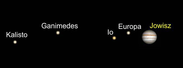 – na prawo od Saturna i nieco dalej, w kierunku południowym, Jowisz – najjaśniejszy punktowy obiekt na niebie. Patrząc na tę planetę przez lornetkę można będzie dodatkowo dostrzec blisko niej i po lewej stronie 4 jej największe księżyce: Kalisto, Ganimedesa, Io i Europę.