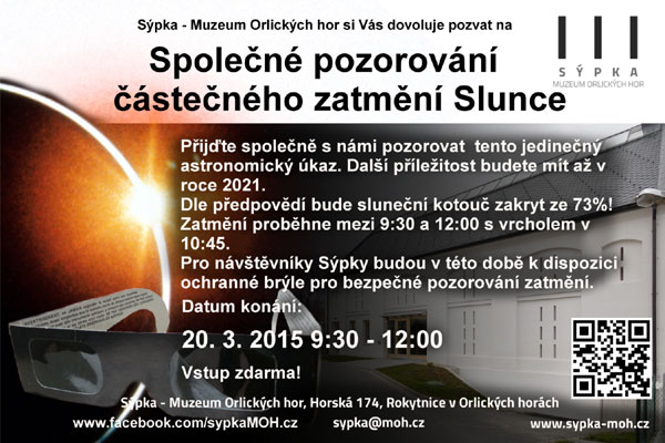 Sýpka - Muzeum Gór Orlickich zaprasza na spotkanie poświęcone częściowemu zaćmieniu słońca, które będzie miało miejsce 20 marca 2015 roku. Spotkanie odbędzie się w siedzibie muzeum w godzinach 9:30 - 12:00 i będzie okazją do wspólnego podziwiania zaćmienia. Taka okazja następny raz zdarzy się dopiero w 2021 roku! Według zapowiedzi słońce zostanie zakryte w 73 %, a apogeum zjawiska będzie miało miejsce ok. godz. 10:45. Dla odwiedzających muzeum przygotowane zostały specjalne okulary, które umożliwią bezpieczne oglądanie zaćmienia. Zapraszamy!