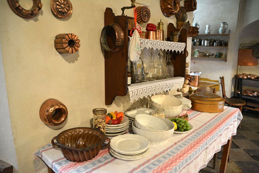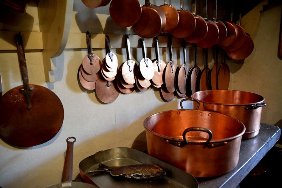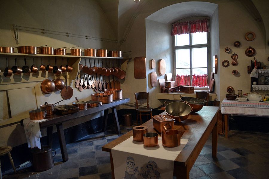 Mamy tu więc wciąż czynne piece, grill, a na ścianach wiszą przyrządy kuchenne, zioła i przyprawy oraz niezwykła kolekcja miedzianych, pięknie wypolerowanych garnków. To ona najbardziej zachwyca zwiedzających i w pamięci wielu z nich pozostawia największe wrażenie z wędrówki po zamku. Zobaczcie zresztą sami w naszej galerii zdjęć…