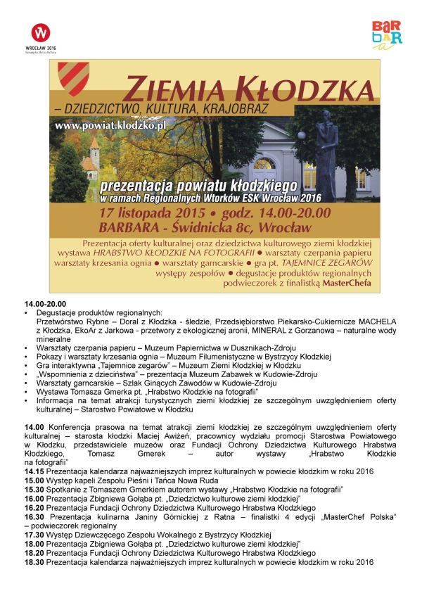 We wtorek, 17 listopada 2015 roku, od godziny 10:00 do 20:00 w Barbarze (Wrocław, ul. Świdnicka 8c) zapraszamy na prezentację oferty kulturalnej oraz dziedzictwa kulturowego powiatu kłodzkiego - w ramach Regionalnych Wtorków Europejska Stolica Kultury Wrocław 2016. W programie wiele warsztatów, pokazów, występów oraz degustacja produktów regionalnych. Wstęp wolny