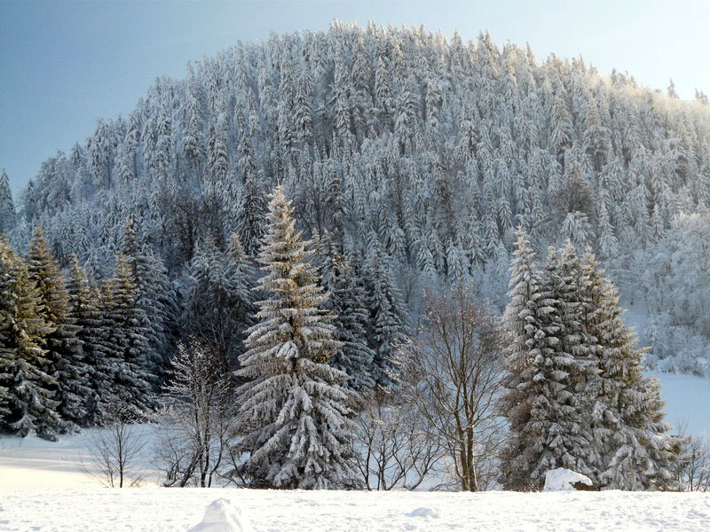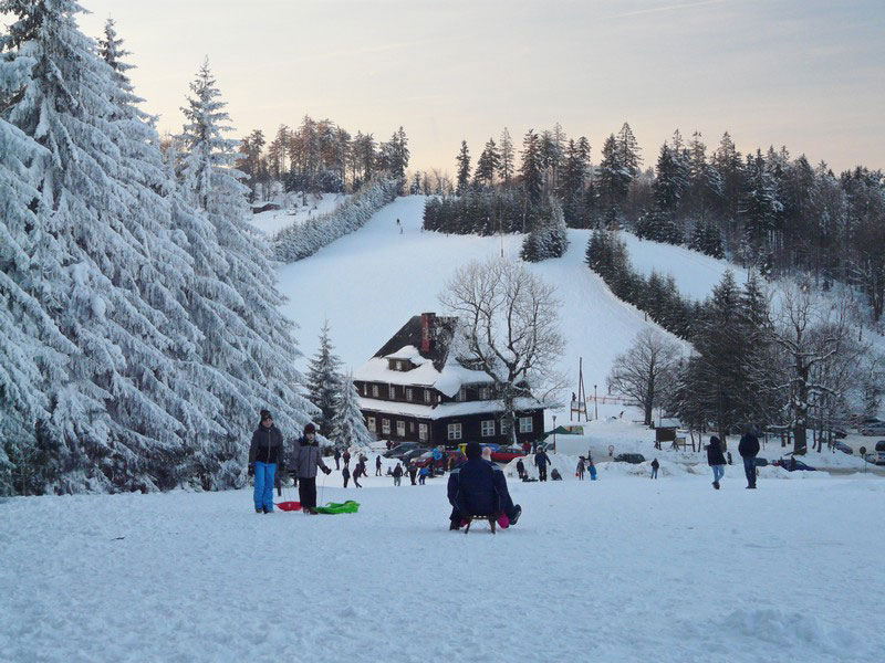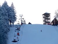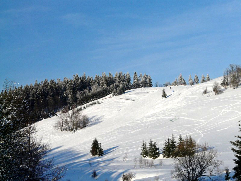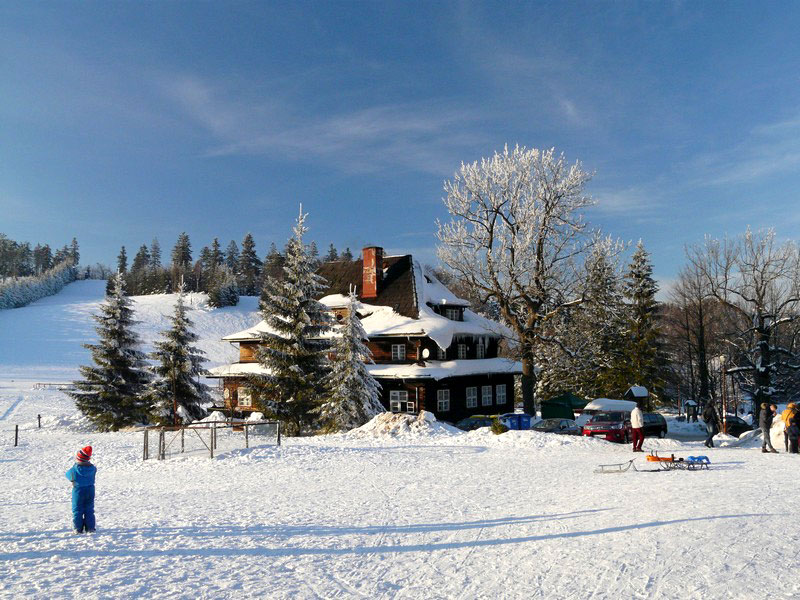 Potem wróciłem do drogi prowadzącej do Jedliny-Zdroju, a następnie przez Głuszycę pojechałem do Andrzejówki. Tam znalazłem prawdziwą zimę. Oszronione i obsypane śniegiem drzewa, wyciągi narciarskie pracujące pełną parą, dorośli i dzieci zjeżdżający na sankach i na czym się da na stoku obok schroniska. Postanowiłem zagłębić się w tę zimową scenerię i poszedłem czerwonym szlakiem w kierunku Przełęczy pod Szpiczakiem. Śnieg był ubity, równy, nogi nie zapadały się w nim, szło się więc komfortowo.