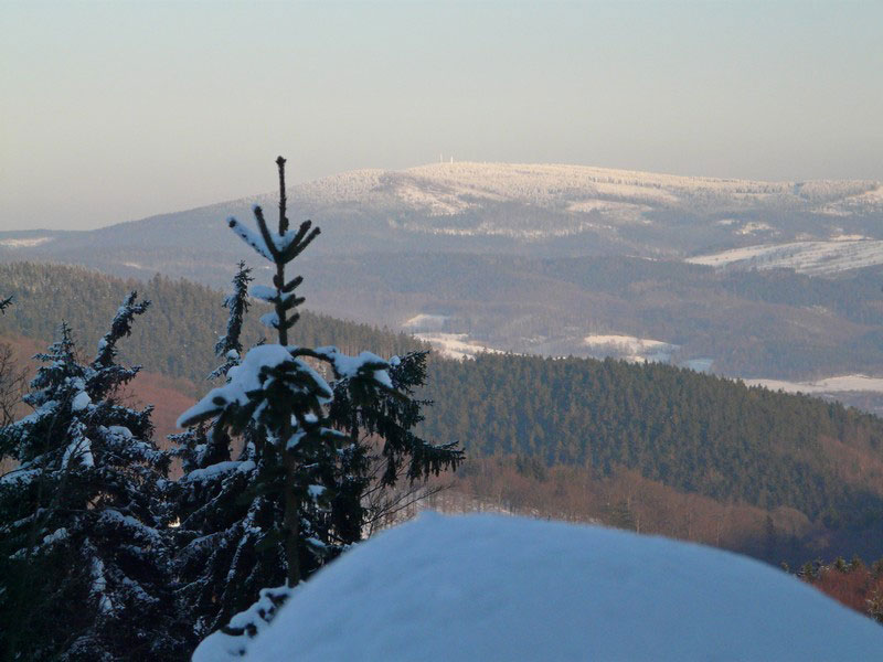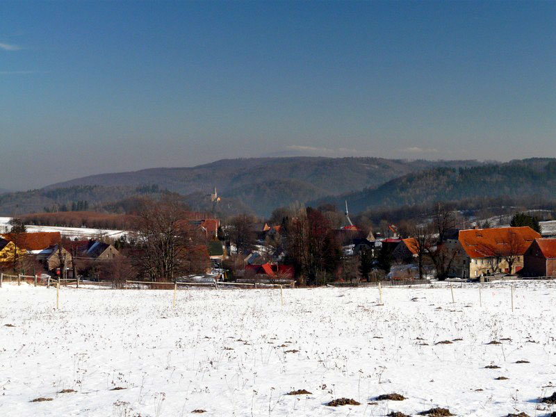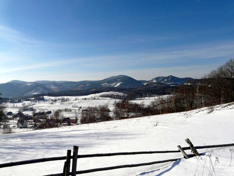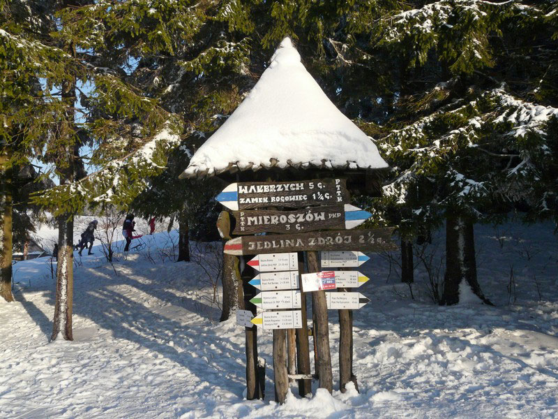 W poszukiwaniu śnieżnej zimy obrałem sobie za cel Andrzejówkę i Masyw Dzikowca. To najwyżej dostępne miejsca w Górach Kamiennych, do których można dotrzeć samochodem lub wyciągiem. Po minięciu Świdnicy zauważyłem robotników pracujących przy torach nieczynnej linii kolejowej prowadzącej do Jedliny-Zdroju. To dobry znak, potwierdzający zgodnie z zapowiedziami przywracanie jej do ruchu. W Zagórzu Śląskim skręciłem w drogę prowadzącą do Jedliny-Zdroju. Nieco przed jej najwyższym punktem, na końcu miejscowości Niedźwiedzica, na wysokości 500 m n.p.m., pojawiła się ciągła pokrywa śnieżna. Z tego miejsca rozpościera się ładny widok na pobliskie góry. Widać też zamek Grodno. Po przejechaniu kilkuset metrów warto ponownie się zatrzymać, aby podziwiać widoki. Stąd, w kierunku zachodnim, widać Góry Wałbrzyskie i dominującą w nich Borową.