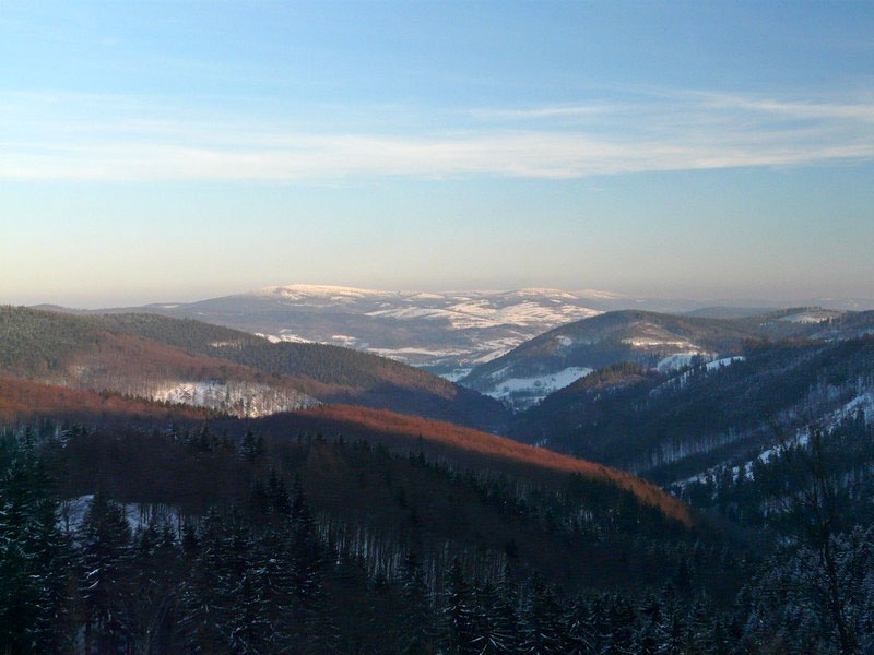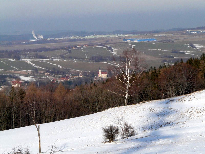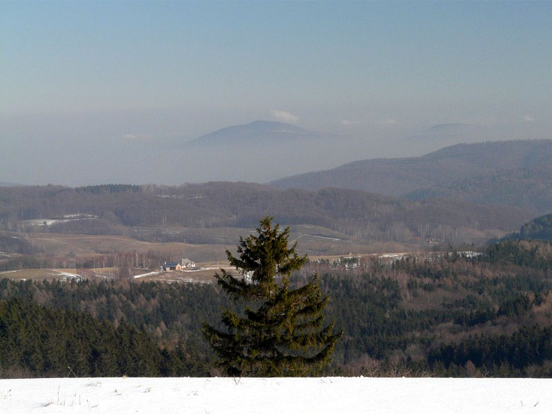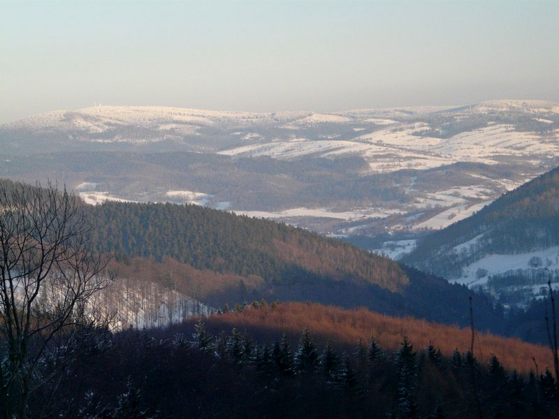 W Podlesiu skręciłem w prawo, a następnie znów w prawo w pierwszą drogę. Wyłożona jest płytami betonowymi i prowadzi do wieży z urządzeniami telekomunikacyjnymi, która znajduje się na jednym z grzbietów Gór Czarnych. Przez jakieś pierwsze 200 m była odśnieżona - znajdują się przy niej domy. Dalej trzeba było już podejść. Spod wieży rozpościerają się bardzo ładne widoki. W kierunku południowo-zachodnim na Góry Wałbrzyskie, północno-zachodnim na Wałbrzych, północnym na część Gór Czarnych i Pogórze Wałbrzyskie. Widać było za nimi Ślężę i Radunię, a właściwie ich górne części. Wydawało się, jakby lewitowały nad niżej znajdującymi się chmurami. Bardziej na prawo łatwo zauważyć można było zamek Grodno i znajdujący się poniżej niego pałac, obecnie opuszczony.