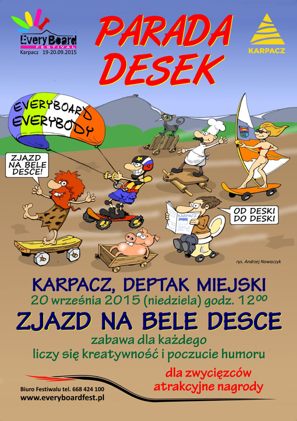 Zapraszamy na czwartą edycję szalonej imprezy, która odbędzie się podczas Everyboard Festival w niedzielę 20 września 2015 roku, o godz. 12:00, w Karpaczu. „Zjazd na bele desce” to rywalizacja z przymrużeniem oka, zabawa dla każdego. Chcielibyśmy zmobilizować dzieci i młodzież do wystartowania w Zjeździe. Przewidujemy podział na kategorię indywidualną i drużynową.